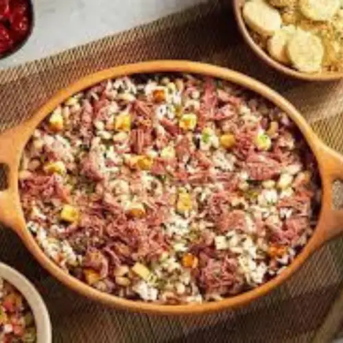 Baião de Dois é um prato tradicional nordestino, feito com arroz, feijão (geralmente verde ou de corda), carne seca, linguiça, bacon e queijo coalho. É uma refeição rica e saborosa, conhecida por sua combinação de ingredientes simples que juntos criam um sabor incrível.