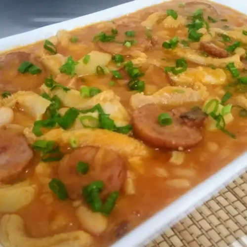 Dobradinha com feijão branco é aquele prato cheio de sabor e história, perfeito pra quem gosta de uma comida caseira e robusta. A dobradinha é feita com o bucho de boi (o famoso estômago) bem limpinho, temperado e cozido até ficar macio. O toque especial vem do feijão branco, que cozinha junto com a carne, absorvendo todo o tempero e criando um caldo encorpado, cheio de sabor. Além disso, o prato ainda ganha reforço de linguiça, bacon e um tempero caprichado de cebola, alho, louro e salsinha. Isso tudo cozido na panela de pedra, que segura bem o calor, ajuda a apurar os sabores e deixa tudo ainda mais gostoso!
