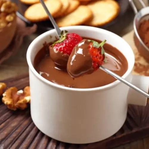 A versão de chocolate surgiu bem mais tarde, possivelmente nos anos 60, nos Estados Unidos, onde o fondue se popularizou em festas e reuniões sociais. A ideia de mergulhar frutas no chocolate derretido ganhou rapidamente popularidade por ser uma sobremesa deliciosa e fácil de preparar.