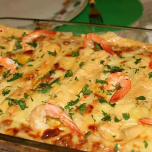 - Montagem: Em uma panela de ferro ou travessa, comece a montar a lasanha. Coloque uma camada de molho de camarão, seguida por uma camada de massa de lasanha. Repita até terminar os ingredientes, finalizando com uma camada generosa de queijo mussarela e parmesão ralado.