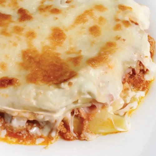 "Delicie-se com a lasanha de vitela, onde a riqueza da carne se une ao molho cremoso para criar uma experiência culinária elegante e irresistível!"