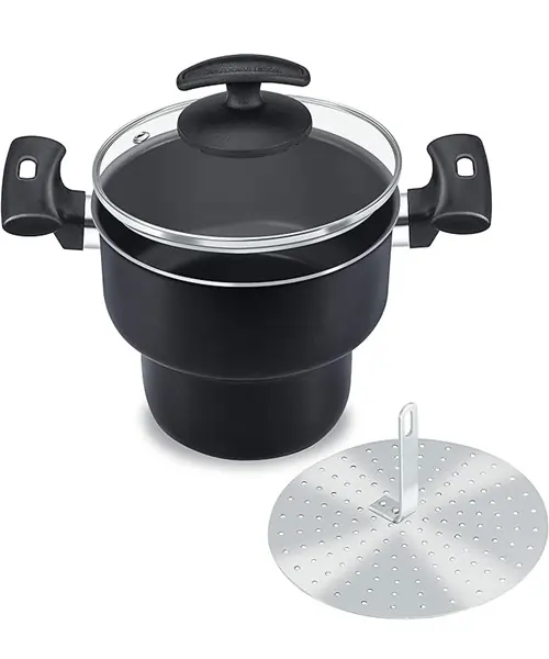 A cuscuzeira Tramontina Turim é perfeita para preparar um cuscuz delicioso para o café da manhã ou jantar. Fabricada em alumínio com revestimento antiaderente Starflon Max, ela garante um cozimento rápido e uniforme, evitando que os alimentos grudem. Suas alças e pegador antitérmicos proporcionam um manuseio seguro e confortável. A tampa de vidro temperado com bordas de aço inox permite acompanhar o cozimento sem perder o vapor. Além disso, a cuscuzeira é compatível com máquinas de lavar louças, facilitando a limpeza.