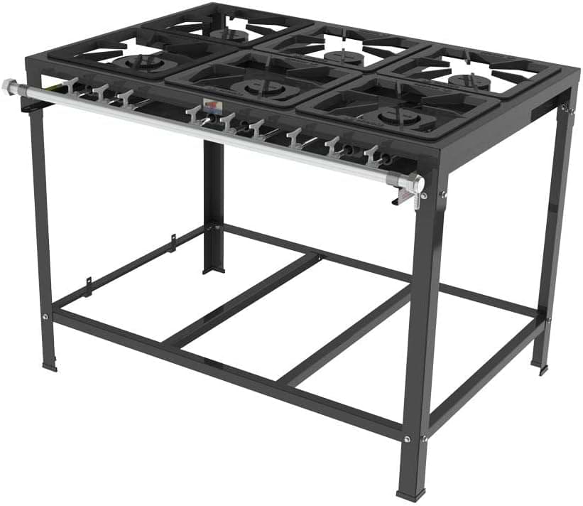 Com seis bocas, sendo três duplas, o equipamento oferece excelente capacidade de preparo simultâneo, atendendo bem cozinhas comerciais com alta rotatividade de pratos.