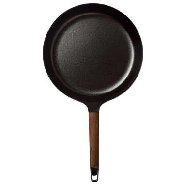 O cabo de madeira da frigideira proporciona uma pegada confortável e segura durante o uso.