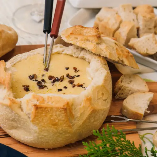 Pão Caseiro: Além da baguete, muitas famílias suíças começaram a fazer seus próprios pães caseiros, especialmente preparados para o fondue. Esses pães geralmente têm uma crosta mais grossa e um miolo denso, perfeito para segurar o queijo derretido.
